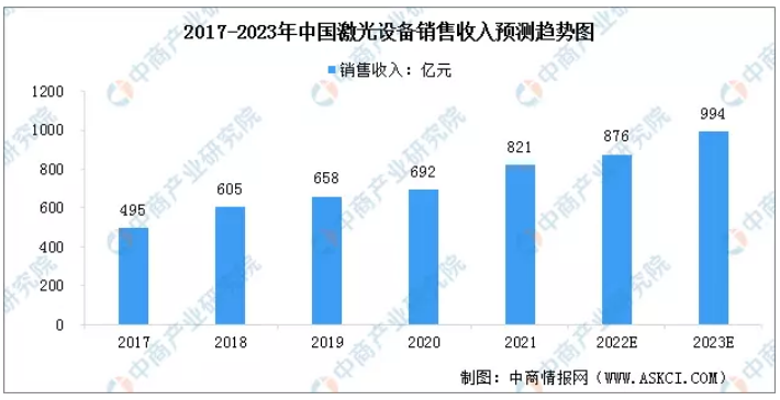 随着新冠肺炎疫情后国民经济的持续复苏,传统制造业转型升级的进一步推进以及激光技术不断发展成熟,各行业对激光设备的需求将不断增长,我国激光设备市场将迎来较长的发展机遇期。根据《2022中国激光产业发展报告》数据,2021年我国激光设备行业市场规模达到821亿元,预计2023年国内激光设备行业市场规模将达994亿元。
