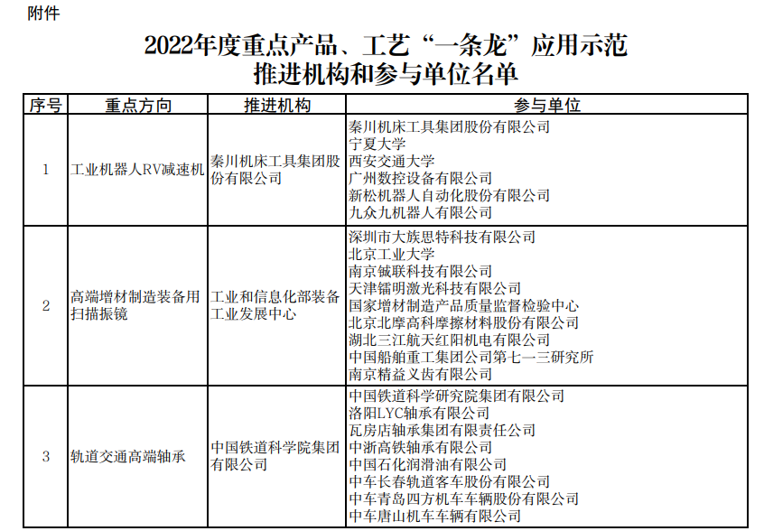 为深入贯彻党的二十大精神,加快推进优质基础产品和先进工艺推广应用,促进形成互融共生、分工合作的产业链协同创新格局,工业和信息化部、国务院国资委联合组织开展了2022年度重点产品、工艺“一条龙”应用示范工作,评选出2022年度重点产品、工艺“一条龙”应用示范方向、推进机构和参与单位名单,现予以公布。