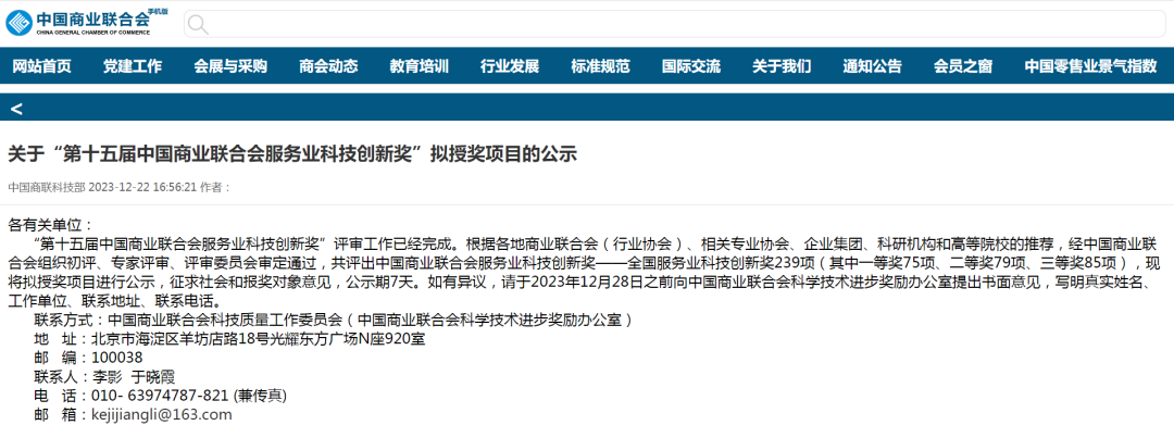 2023年12月22日,中国商业联合会发布了关于“第十五届中国商业联合会服务业科技创新奖”拟授奖项目的公示。根据各地商业联合会(行业协会)、相关专业协会、企业集团、科研机构和高等院校的推荐,经中国商业联合会组织初评、专家评审、评审委员会审定通过,共评出中国商业联合会服务业科技创新奖——全国服务业科技创新奖239项(其中一等奖75项、二等奖79项、三等奖85项)。