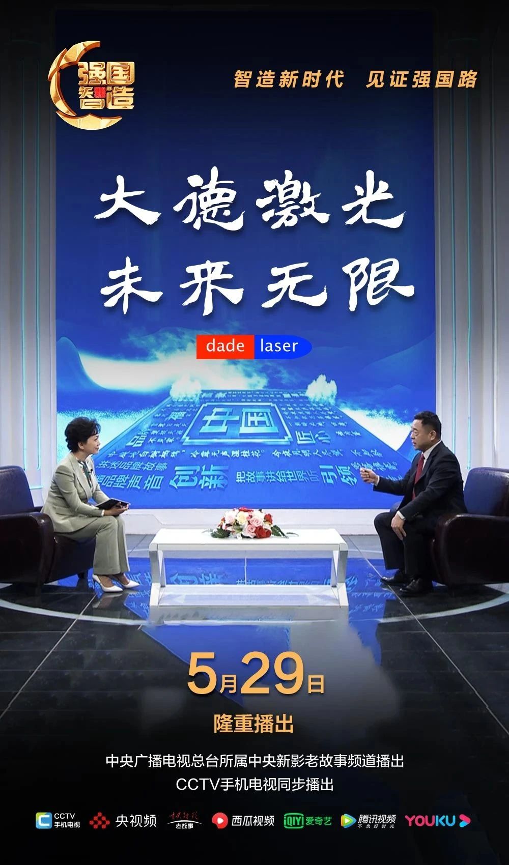 网络平台:央视频、爱奇艺、搜狐视频、优酷、腾讯、抖音、西瓜视频、快手、好看视频等平台,APP内搜索《大德激光 未来无限》,大家敬请收看!