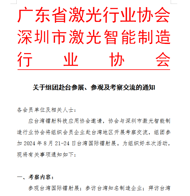 应台湾镭射科技应用协会邀请,协会与taptap点点链接将组织会员企业赴台湾地区开展考察交流,组团参加2024年8月21-24日台湾国际镭射展。为组织好本次活动,现将有关事项通知如下: