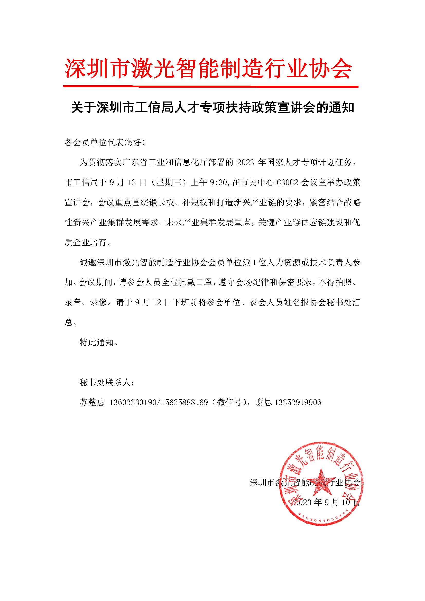 关于深圳市工信局人才专项扶持政策宣讲会的通知