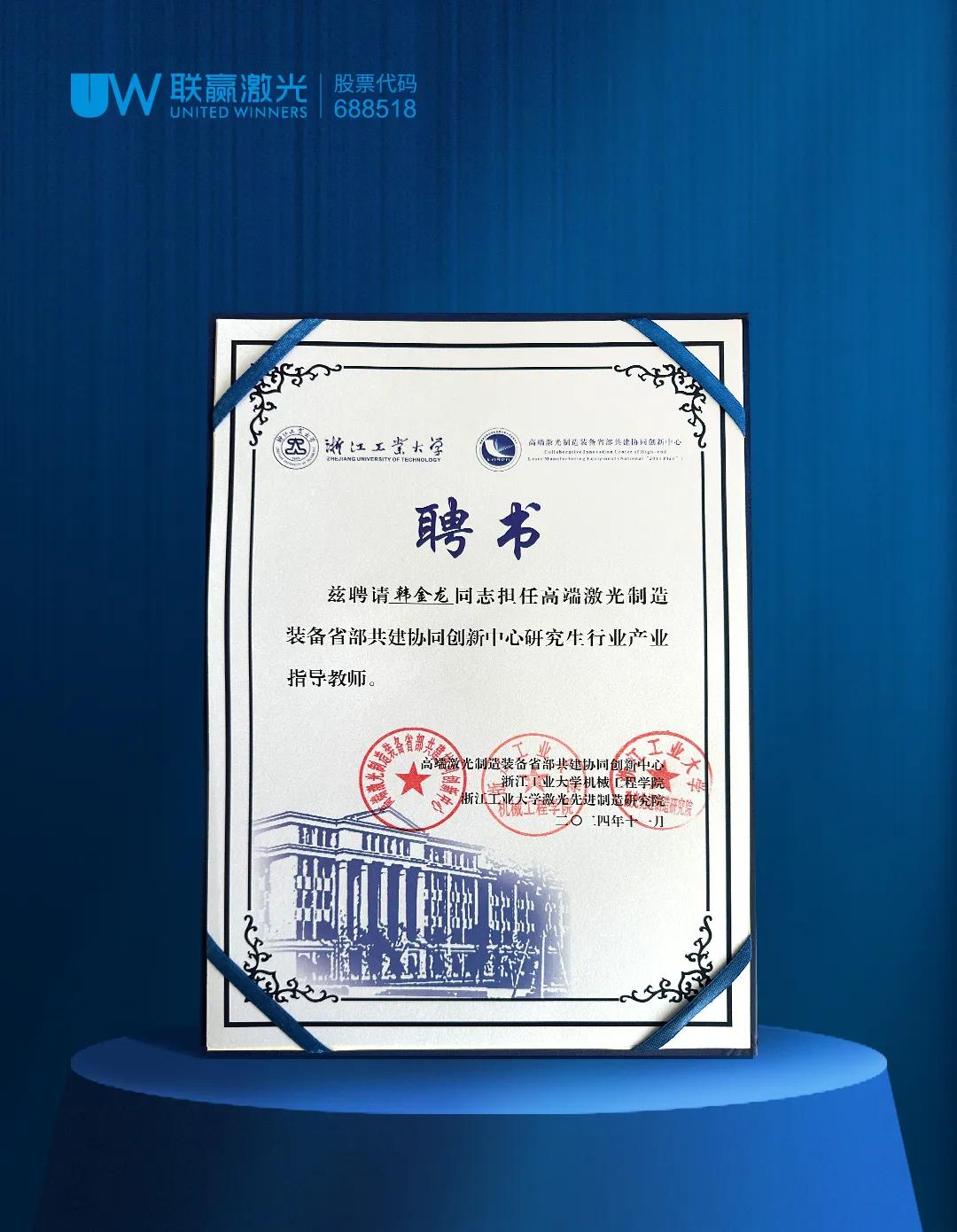 此次合作,联赢激光董事长韩金龙先生被正式聘请为高端激光制造装备省部共建协同创新中心研究生行业产业指导教师。此举促进了高校科研与产业实践的深度融合,为研究生们搭建起一座连接学术理论与行业实际应用的坚实桥梁。