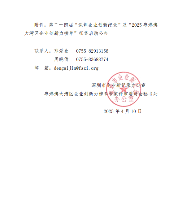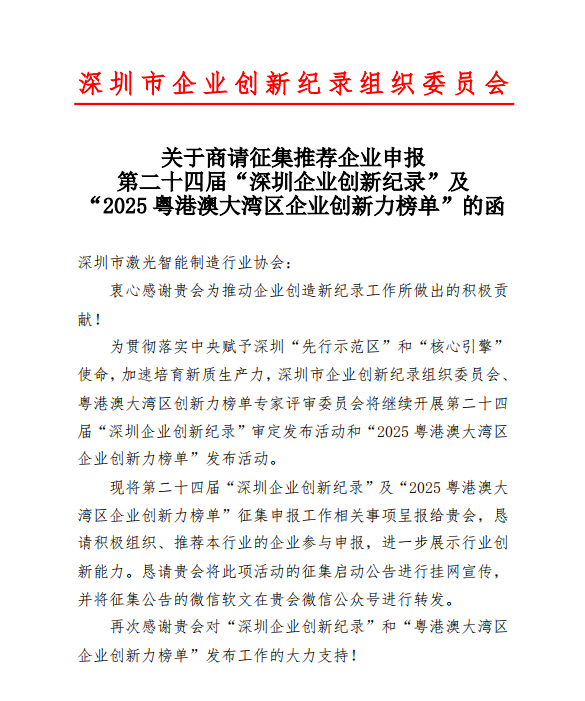 关于商请征集推荐企业申报第二十四届“深圳企业创新纪录”及 “2025粤港澳大湾区企业创新力榜单”的函