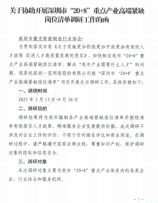 为贯彻落实深圳市委《关于实施更加积极更加开放更加有效的人才政策促进人才高质量发展的意见》,加快制定市各重点产业高端紧缺岗位清单,解决我市重点产业人才需求痛点,深圳市人力资源和社会保障局就“深圳市‘20+8’重点产业高端紧缺岗位清单”项目开展走访调研工作,深圳市先进制造业促进会将协助人社局组织深圳市高端装备与仪器相关单位参加调研座谈会。