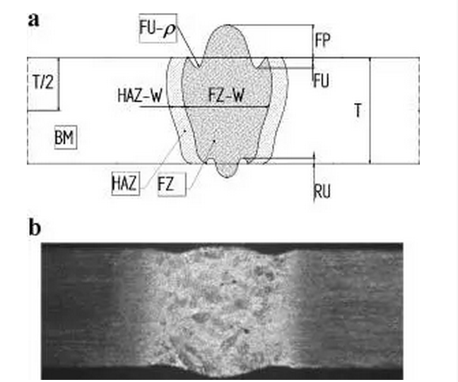 图2.1 (a)焊缝典型的横截面示意图。FU:表面填充,RU:根部填充,FU-ρ:表面填充半径,FZ-W:熔融区宽度,HAZ-W:热影响区宽度;(b)典型横截面的宏观图(1.2kW,42mm / s的焊缝)