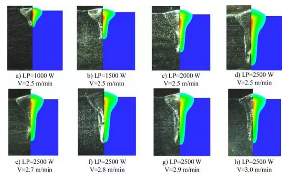 在功率恒定的情况下,焊接速度的增加导致加热时间过短,不足以产生显著的熔池深度。在高焊接速度下,模拟结果与实验数据一致。由于在较低速度下,光束在匙孔内多次反射,吸收率增加,模拟略微不同于实验。热影响区随着焊接速度的增加而减小。