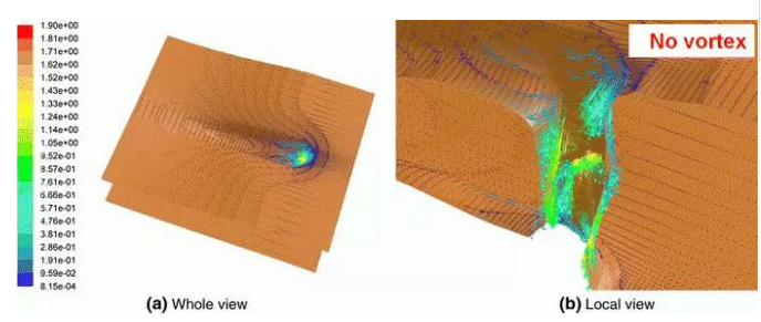 对于较低功率,较低速度的焊接,匙孔后面的流体流动是湍流和不稳定的,并且形成涡流。预测熔融金属从熔池的中心面流走,并且在熔池中,匙孔的后面留下间隙或空隙。对于较高功率,较高速度的焊接,流体流动并不湍急,不形成这种涡流。模拟预测的工件表面处的流体流速如图5.3。