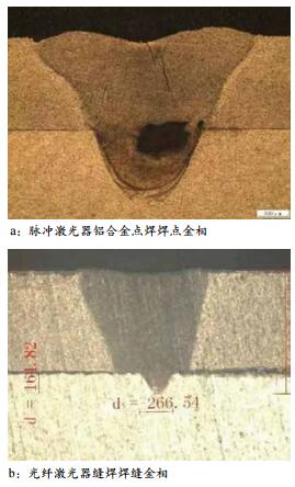 脉冲激光器铝合金点焊焊点与光纤激光器缝焊焊缝金相对比如图 3 所示,由图 3 可知,光纤激光器连续缝焊条件下,裂纹和气孔都得到了明显的改善。